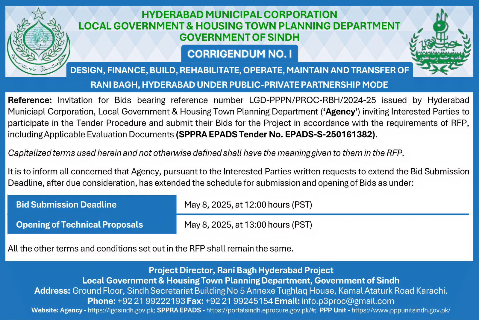The Government of Sindh intends to implement the “Rehabilitation of Rani Bagh” in Hyderabad under PPP mode.